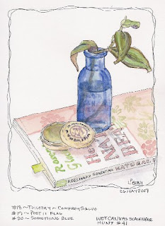 This was a tough little still life to put together. I'd used up most of the "interior" objects on the list already. I needed 'something blue', a 'toiletry' and 'any flag you see'. Debated using a small American flag as the backdrop but it just didn't go. Then I thought about the Post-it flags I use to mark pages I refer to frequently in books and this all came together.
